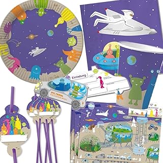 90-tlg. WELTRAUM PARTY SET für Kindergeburtstag mit 6-8 Kinder: Teller, Becher, Servietten, Einladungen, Papier-Trinkhalme, Platzsets, Luftballons, Luftschlangen uvm | Geburtstag Kinder Party Alien Kinderparty Ufo Space Weltall All