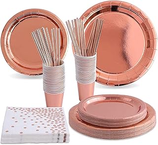 KAHEIGN 146Pcs Rosegold Partygeschirr Set für 24 Gäste, Partygeschirr zubehör Set inkl. Papier Teller Tassen Strohhalme Servietten für Geburtstagsparty Dekoration